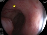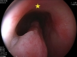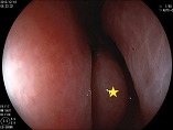 ①鼻前庭を通過後、スコープを顔面に対してほぼ垂直方向に向けていきます。鼻腔底(下図★)を確認します。