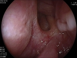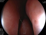 鼻粘膜には写真下のように挿入ルートに沿って前処置スティックによるわずかな発赤を確認することができます。この前処置スティックによる摩擦痕を確認しながらスコープを進めます。
