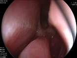 鼻腔挿入直前にストレートな先端可動部に 5~10°のわずかにアップをかけます。スコープをノーズピースを抜け鼻前庭にスコープを進めます。鼻前庭に残っているビスカスがレンズ面に付着しないように注意して鼻前庭を通過します。